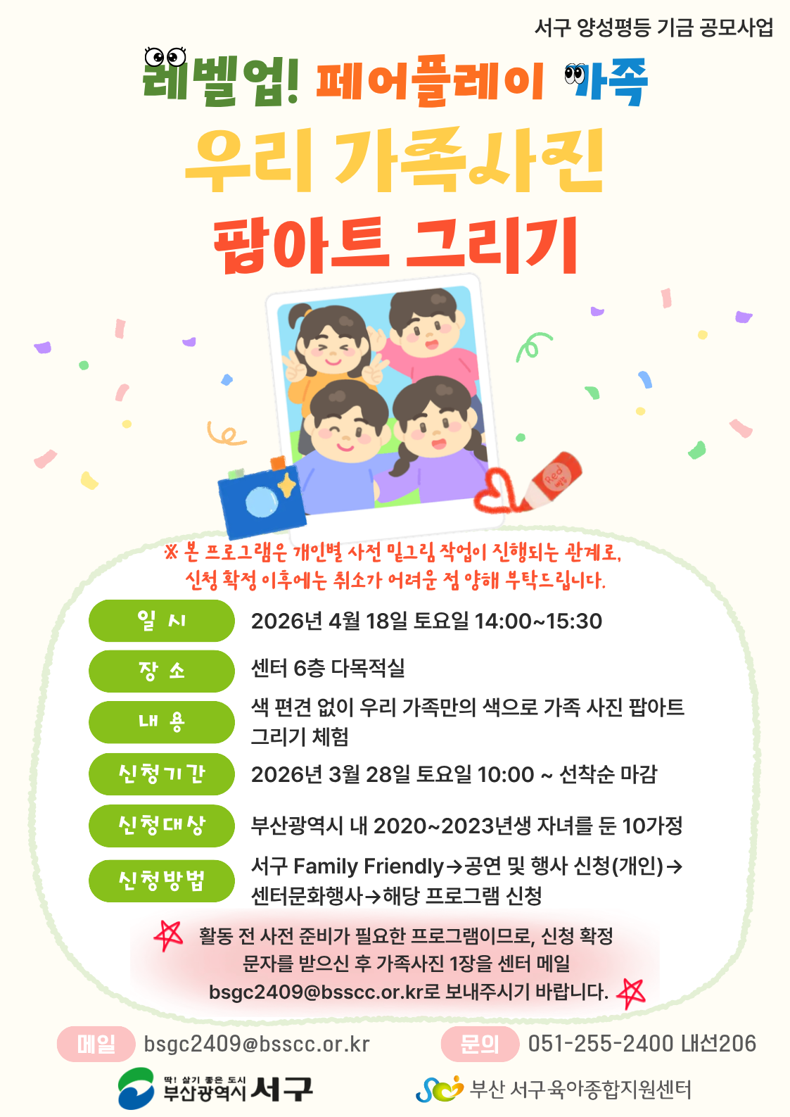- [서구 양성평등기금 공모사업] 레벨업! 페어플레이 가족 (양성평등 부모-자녀 체험 프로그램) 안내
