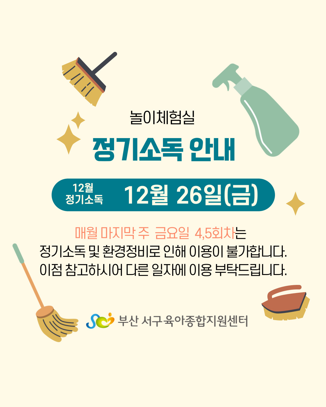 부산서구육아종합지원센터 놀이체험실 12월 정기소독 관련하여 안내드립니다.