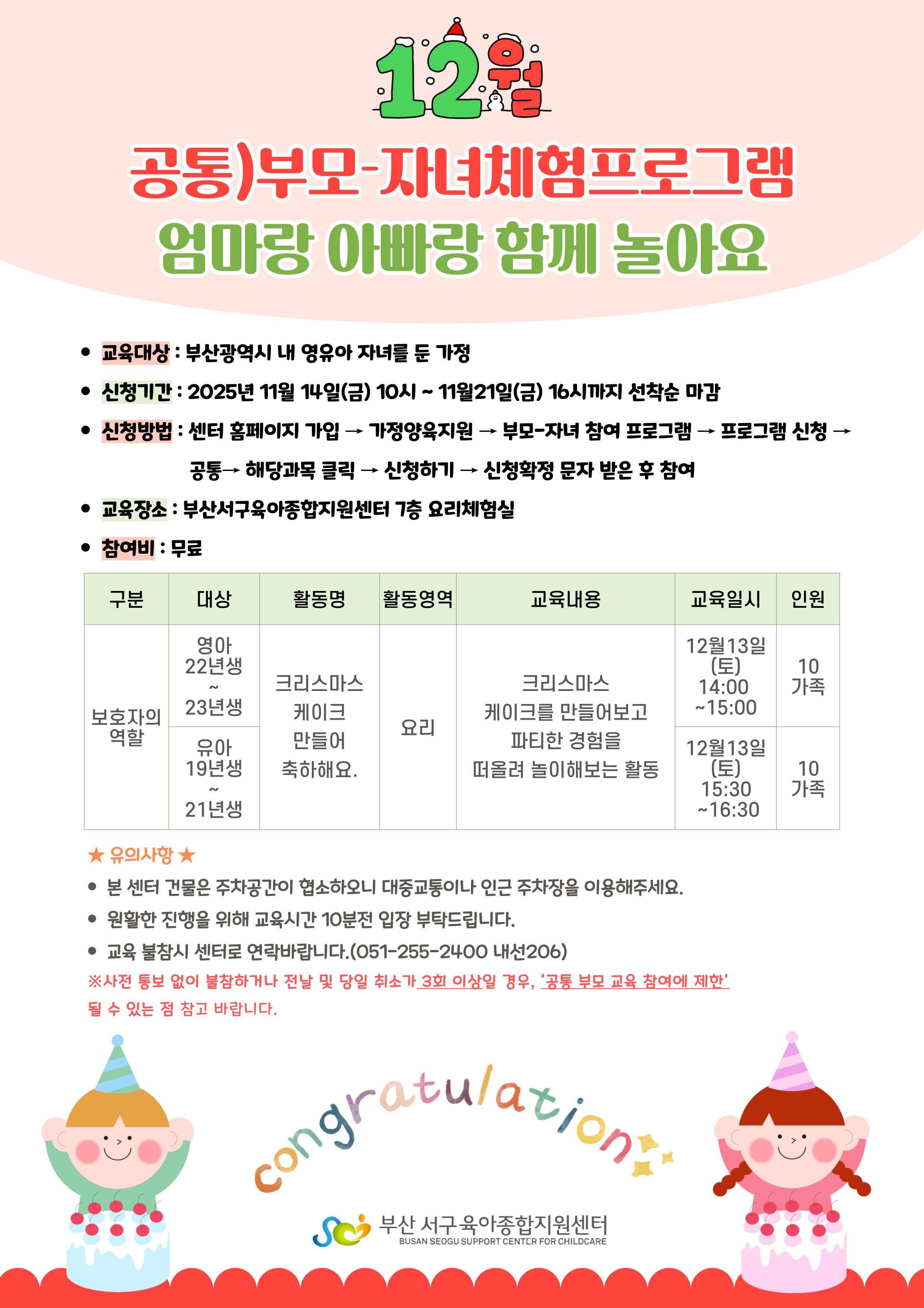 [안내] 12월 공통)부모-자녀 체험 프로그램 엄마랑 아빠랑 함께 놀아요 신청 안내