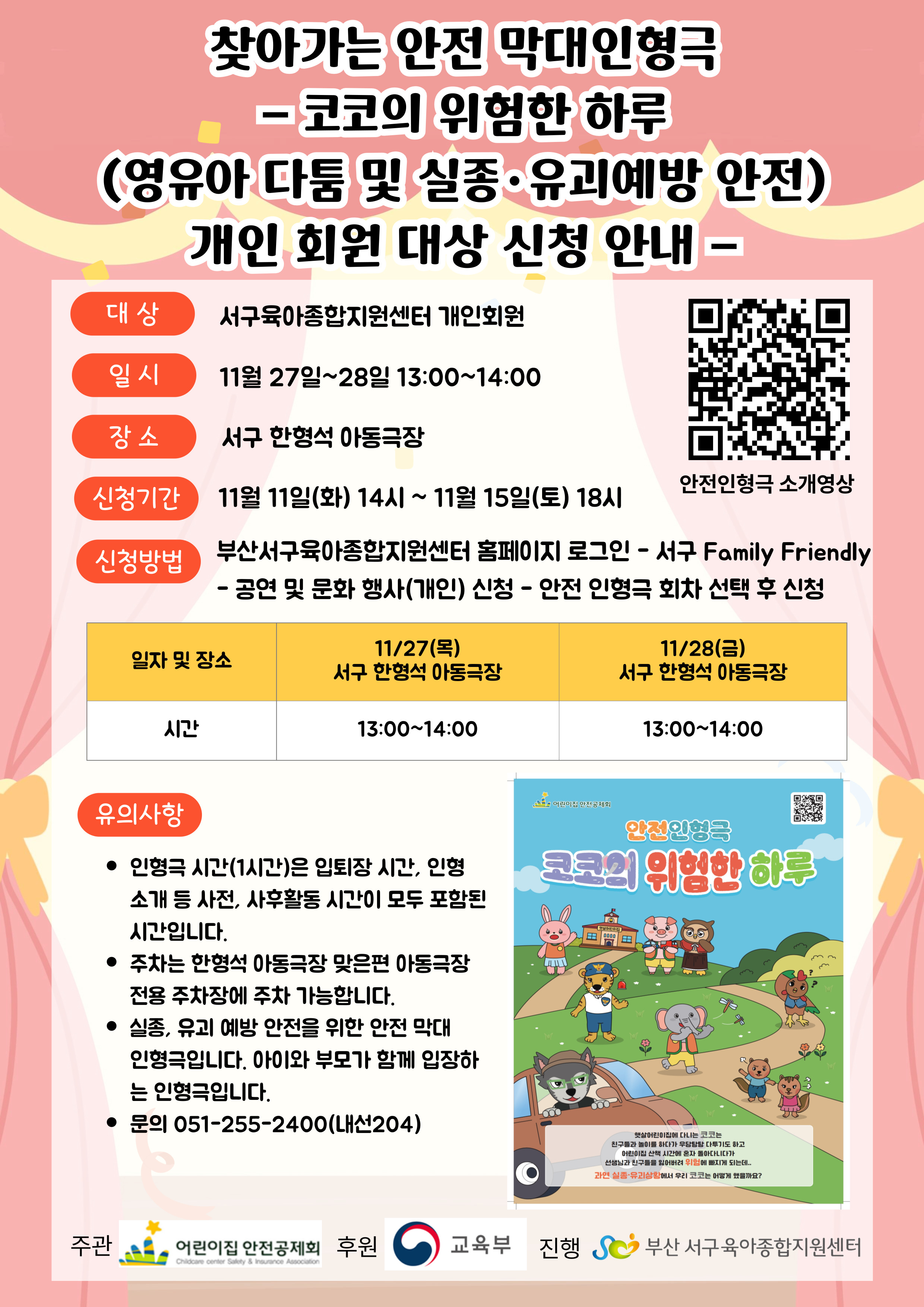 [안내] 찾아가는 안전인형극 '코코의 위험한 하루' - 영유아 다툼 및 실종 유괴 예방 안전인형극 개인회원 대상 신청 모집 안내