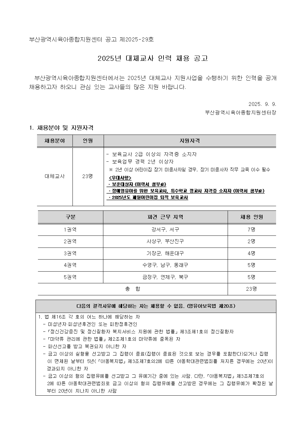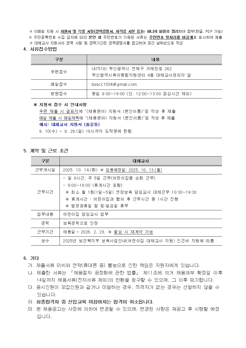 2025년 부산광역시육아종합지원센터 대체교사 채용 공고