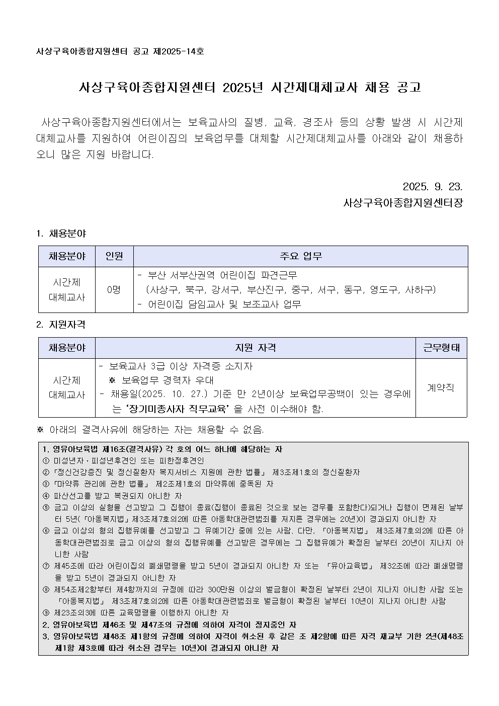 2025년 사상구육아종합지원센터 시간제대체교사지원사업 채용 공고