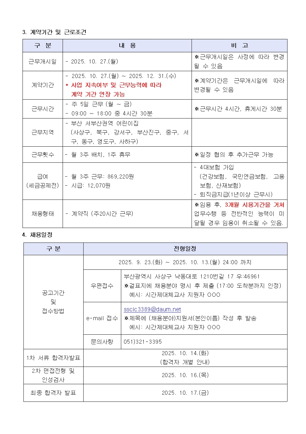 2025년 부산광역시육아종합지원센터 대체교사 채용 공고