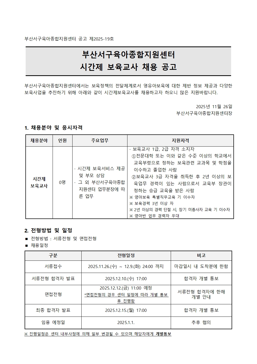 2025년 부산서구육아종합지원센터 시간제 보육교사 공개 채용 공고