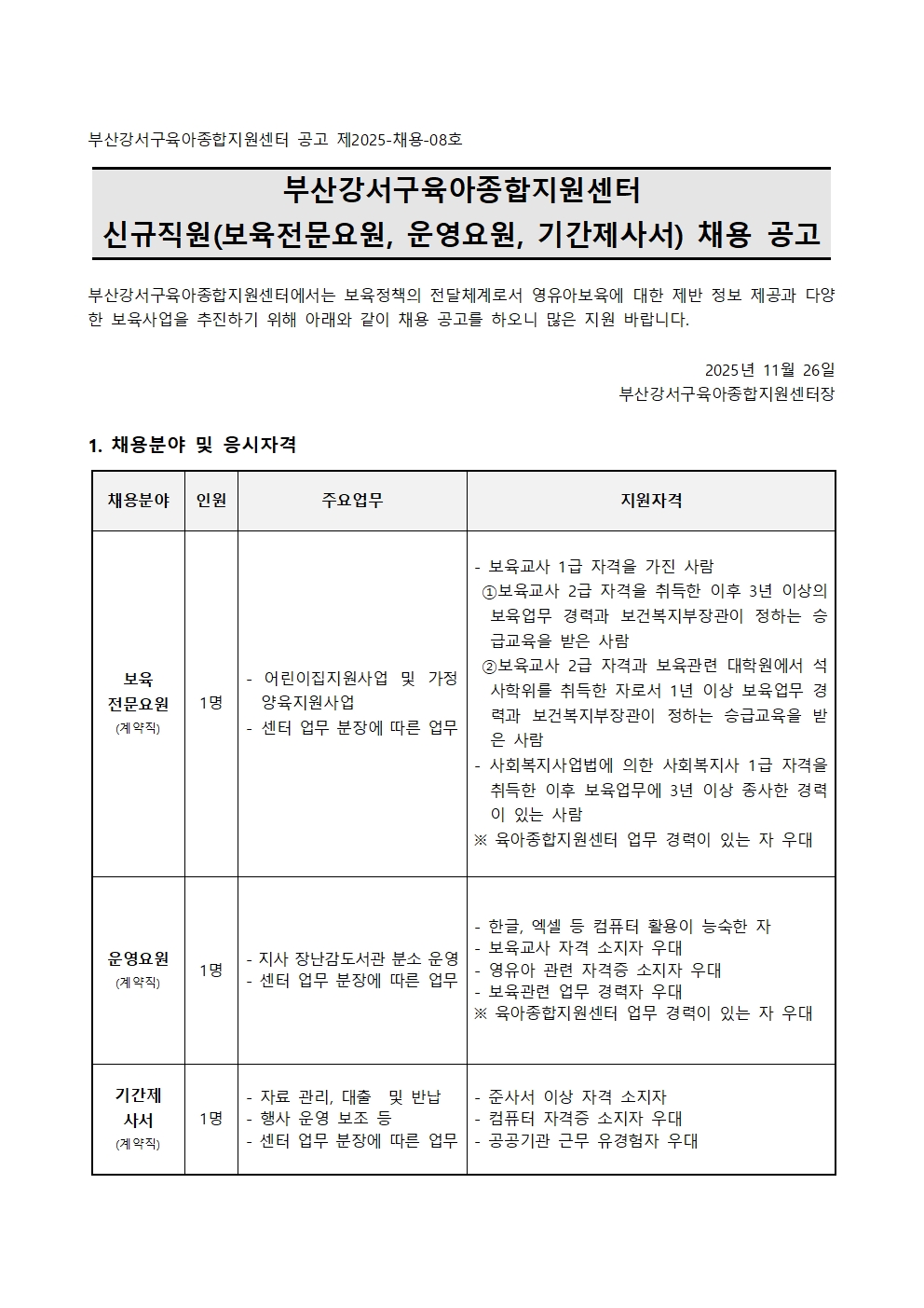 붙임 1_ 부산강서구육아종합지원센터 신규직원(보육전문요원, 운영요원, 기간제 사서) 채용 공고문 (1).hwp