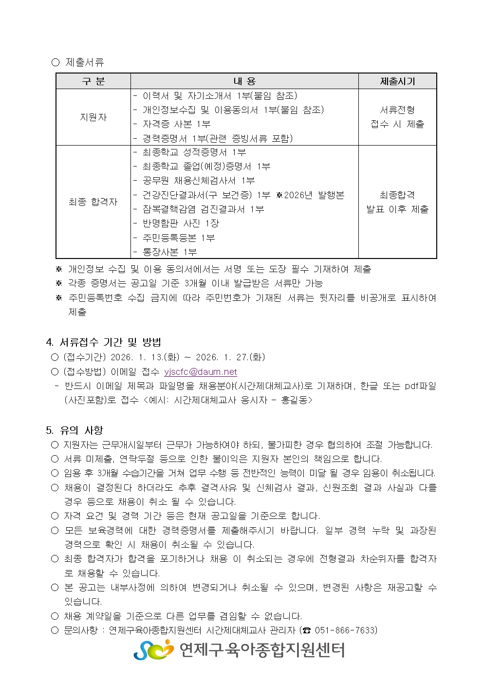 연제구육아종합지원센터 시간제대체교사 공개채용 공고