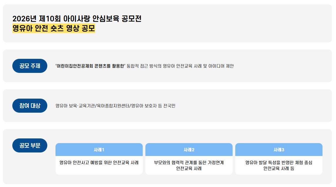 영유아 안전에 대한 사회적 공감대를 형성하고 안전 의식을 제고하고자 매년 공모전을 진행하고 있습니다.
