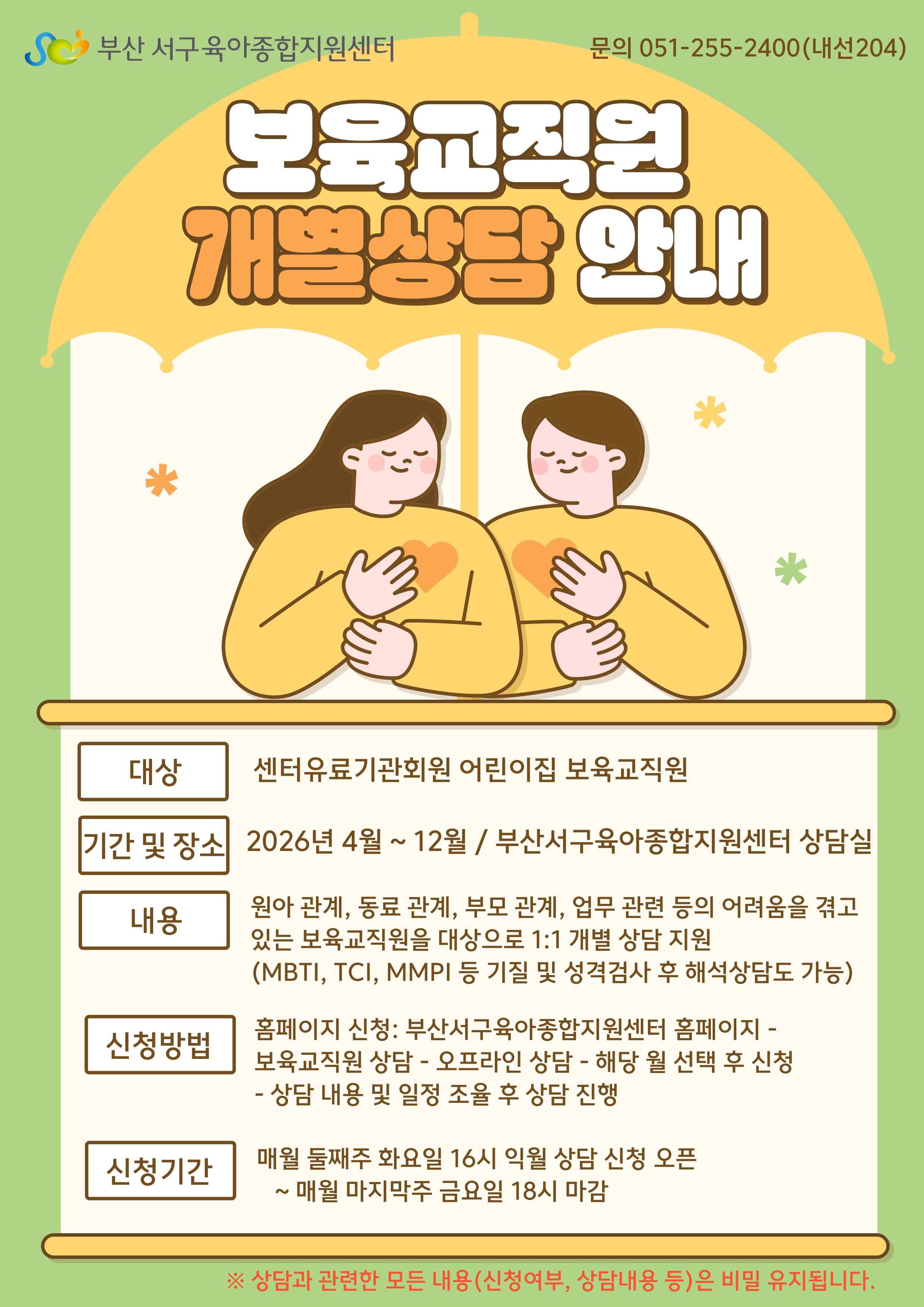 2026년 4월부터 진행될 보육교직원 개별 상담 사업을 안내드립니다.