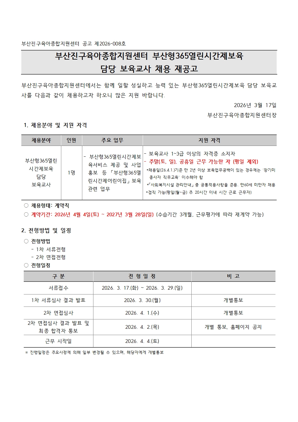 붙임 1. 부산진구육아종합지원센터 부산형365열린시간제보육 담당 보육교사 채용 재공고.hwp