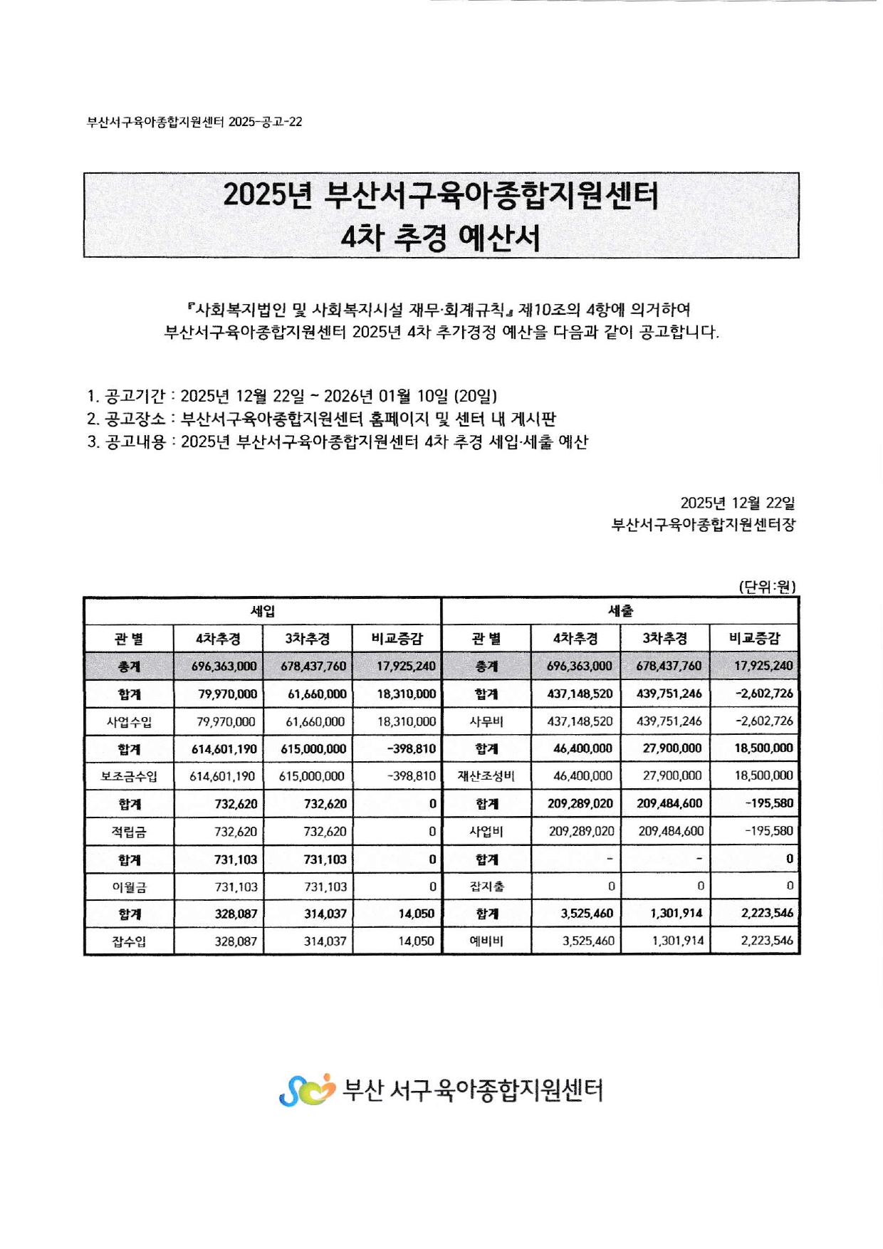 2025년 부산서구육아종합지원센터 4차 추경 예산 공고
