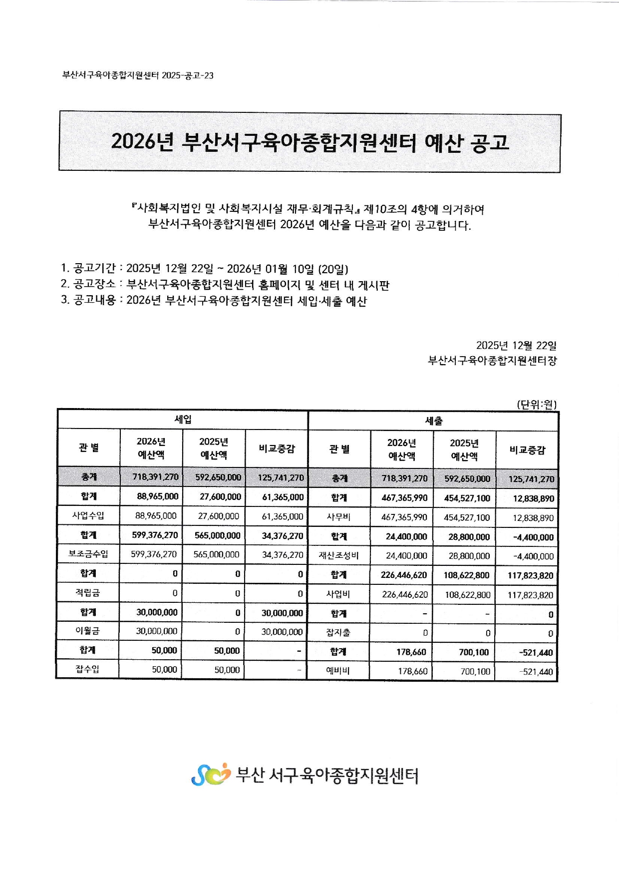 2025년 부산서구육아종합지원센터 4차 추경 예산 공고