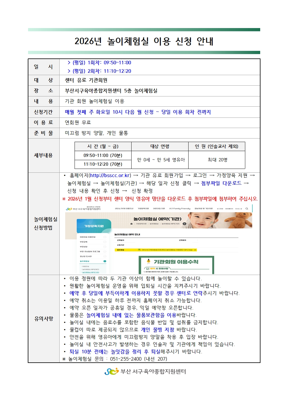 부산서구육아종합지원센터 놀이체험실 이용 신청 관련 안내드립니다.