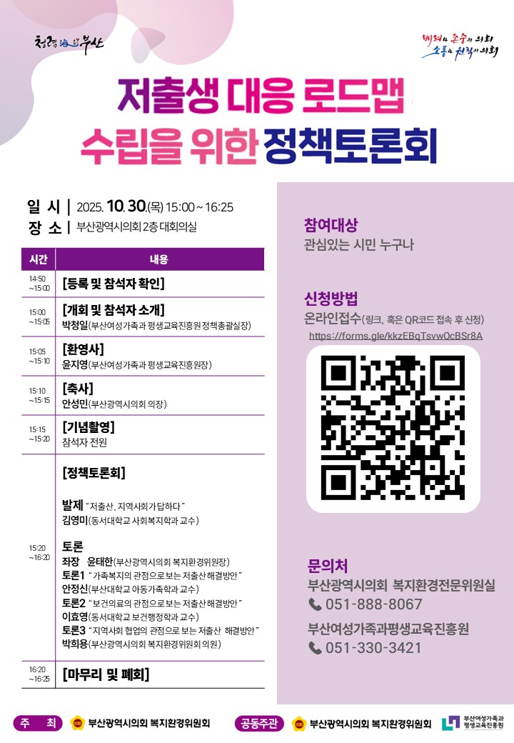 부산여성가족과평생교육진흥원에서 개최하는 「2025년 제5차 부산광역시 저출산 종합계획 수립을 위한 시민토론회」를 안내드립니다.