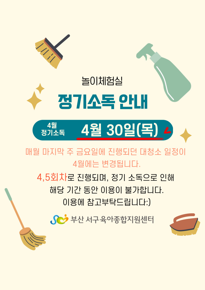 4월 정기소독은 4/30(목)에 진행됩니다.