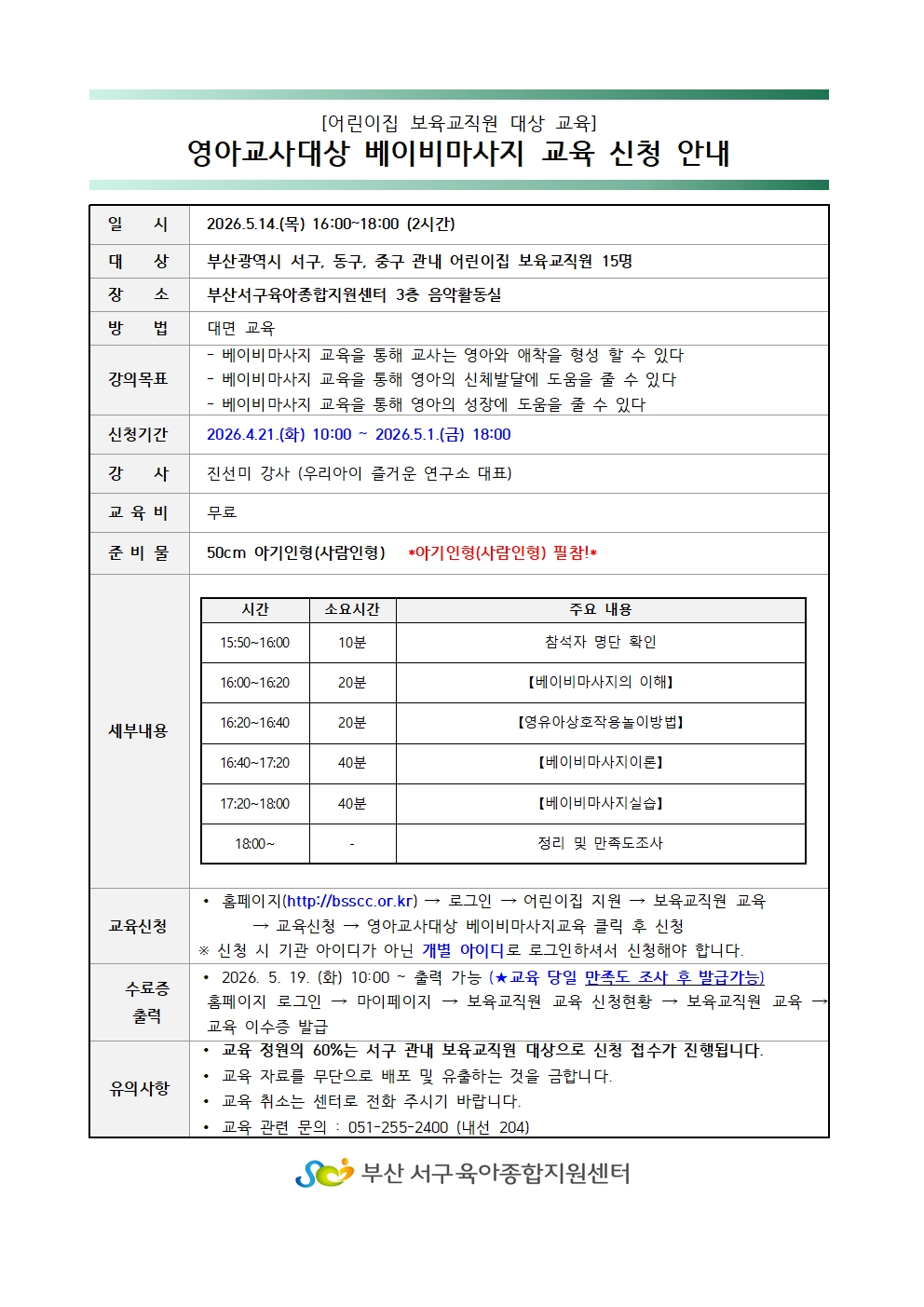 5/14(목)에 진행될 영아교사대상 베이비마사지 교육을 안내드립니다.