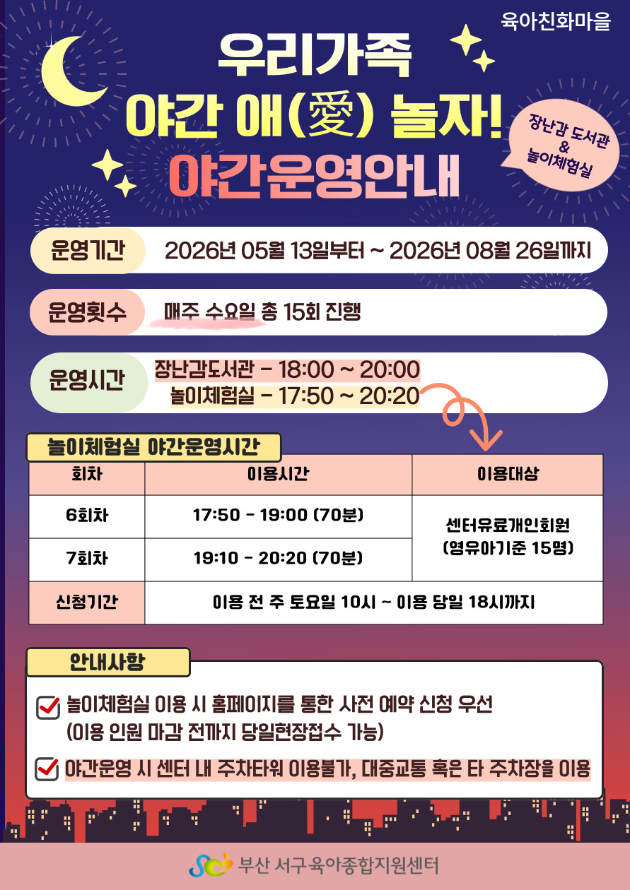 부산서구육아종합지원센터 장난감도서관과 놀이체험실이 야간운영을 시작합니다! 2026년 5월부터 8월까지 매주 수요일, 총 15회 진행되며, 운영 시간과 일자를 확인하신 후 이용해 주시기 바랍니다.
