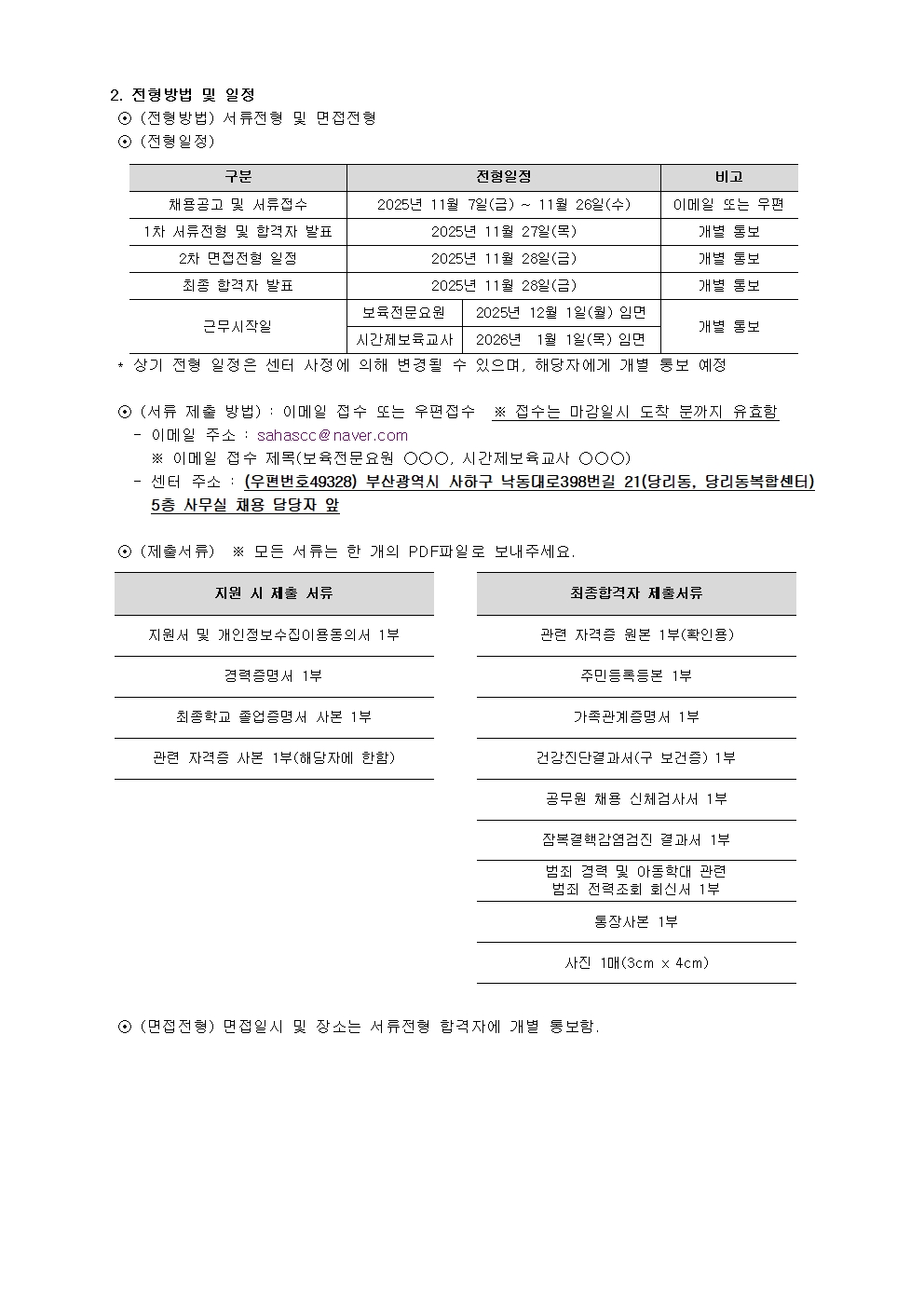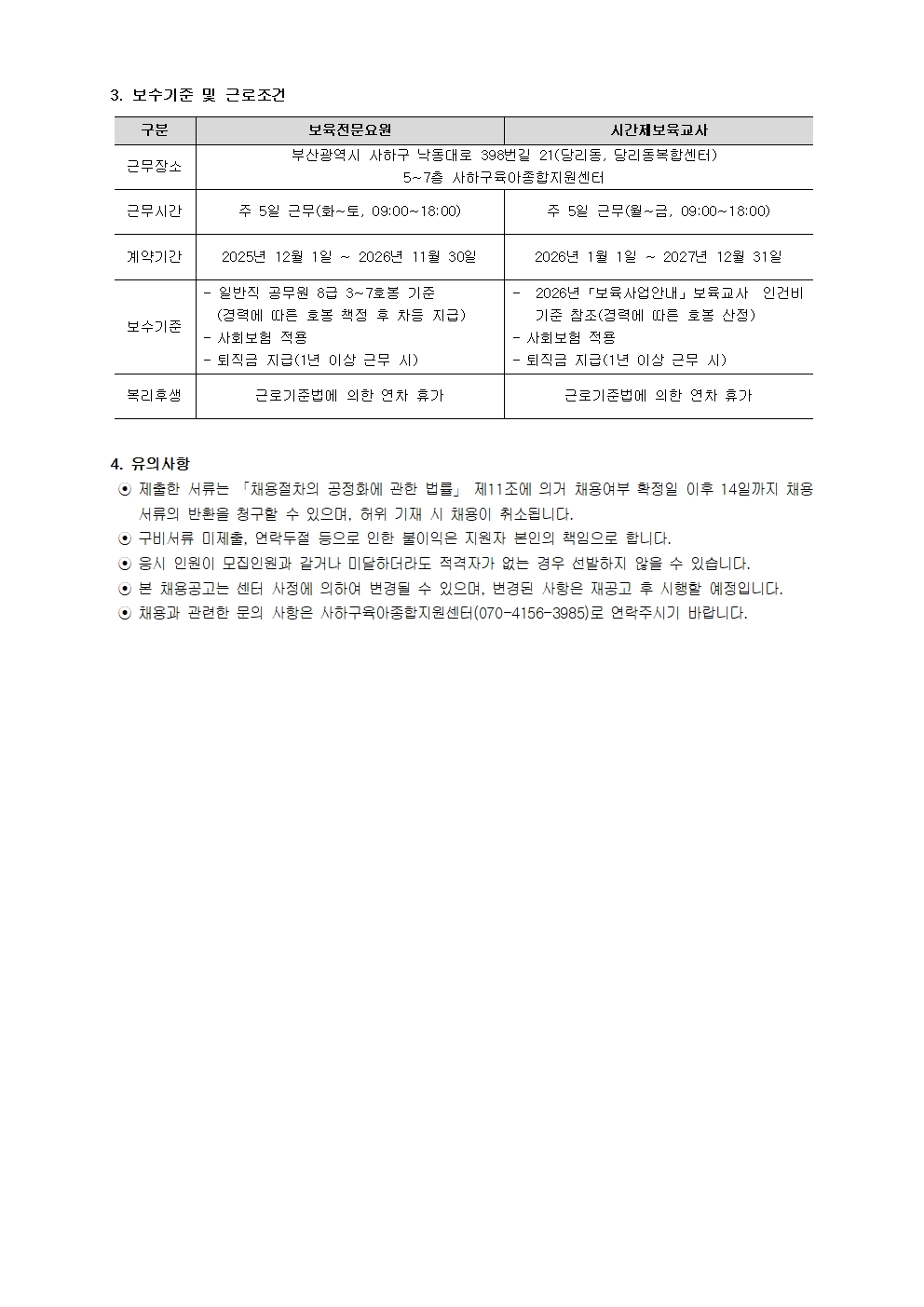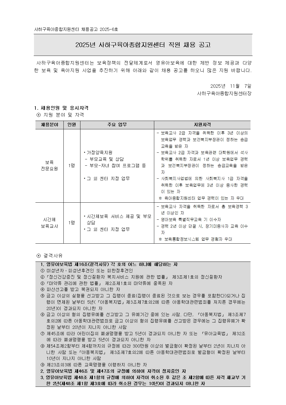 (사하구육아종합지원센터 채용공고 2025-06호) 사하구육아종합지원센터 직원(보육전문요원) 채용 공고문 (2).hwp