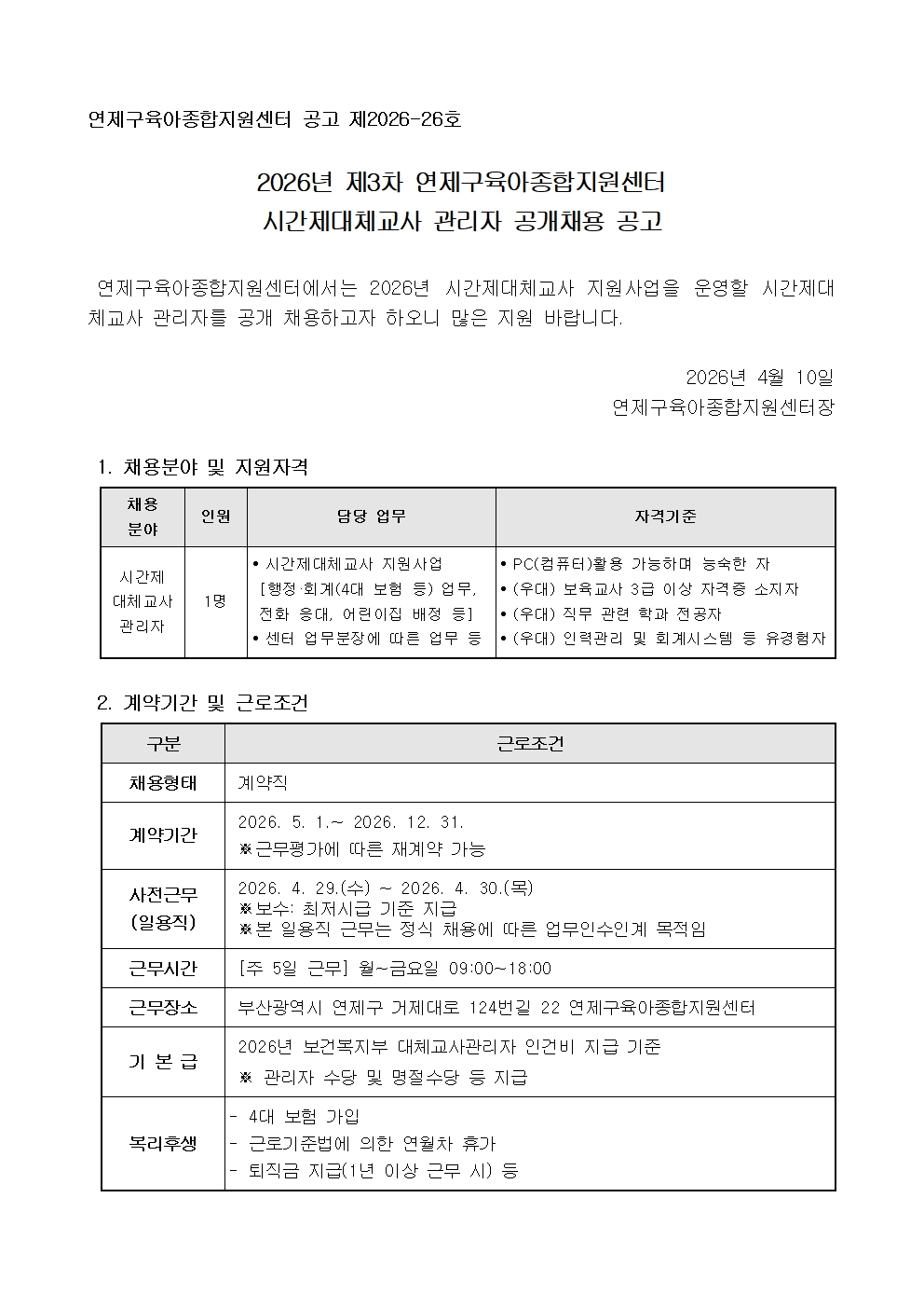 연제구육아종합지원센터 2026년 제3차 시간제대체교사 관리자 공개채용