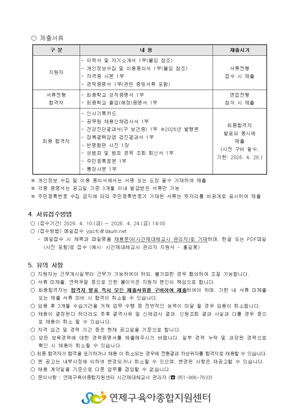 붙임1_연제구육아종합지원센터 제3차 시간제대체교사 관리자 공개채용 공고문 1부.hwp