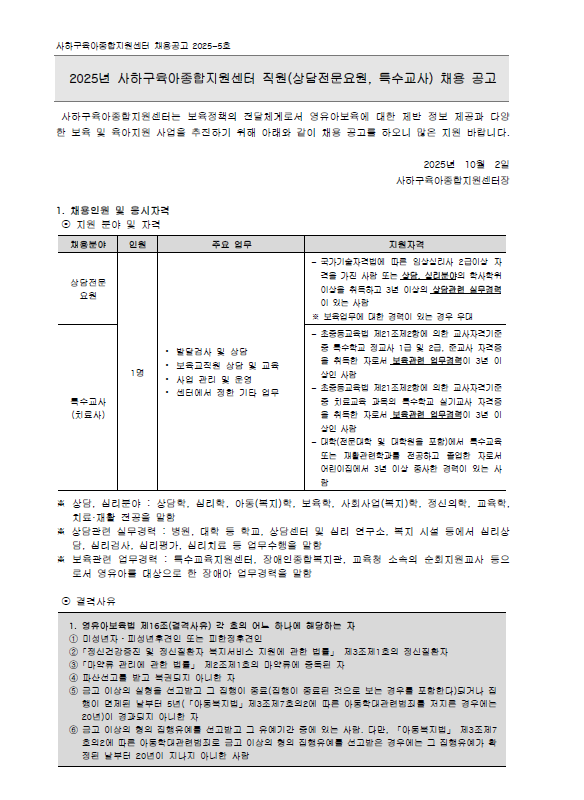 (사하구육아종합지원센터 채용공고 2025-05호) 사하구육아종합지원센터 직원(상담전문요원, 특수교사) 채용 공고문.pdf