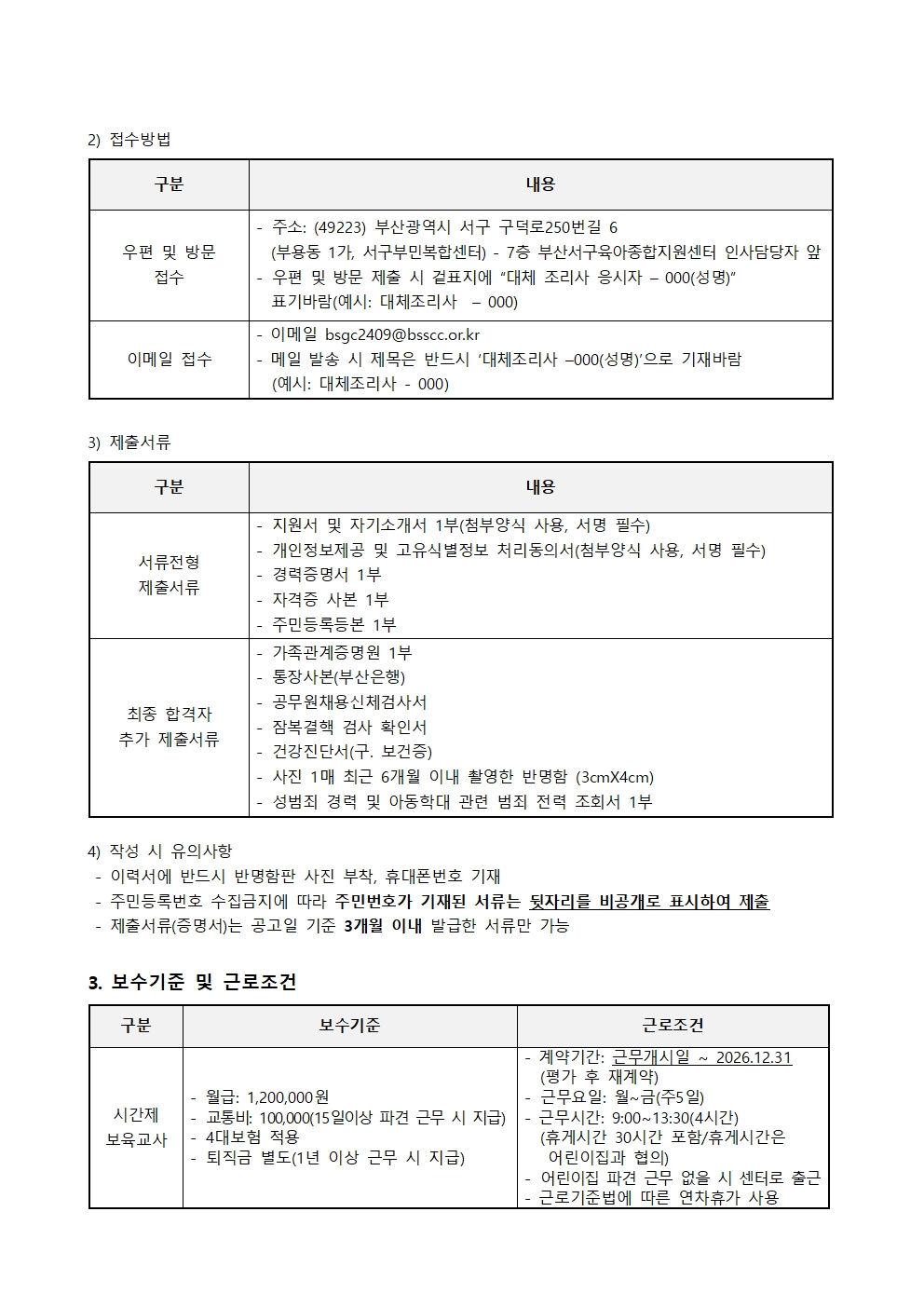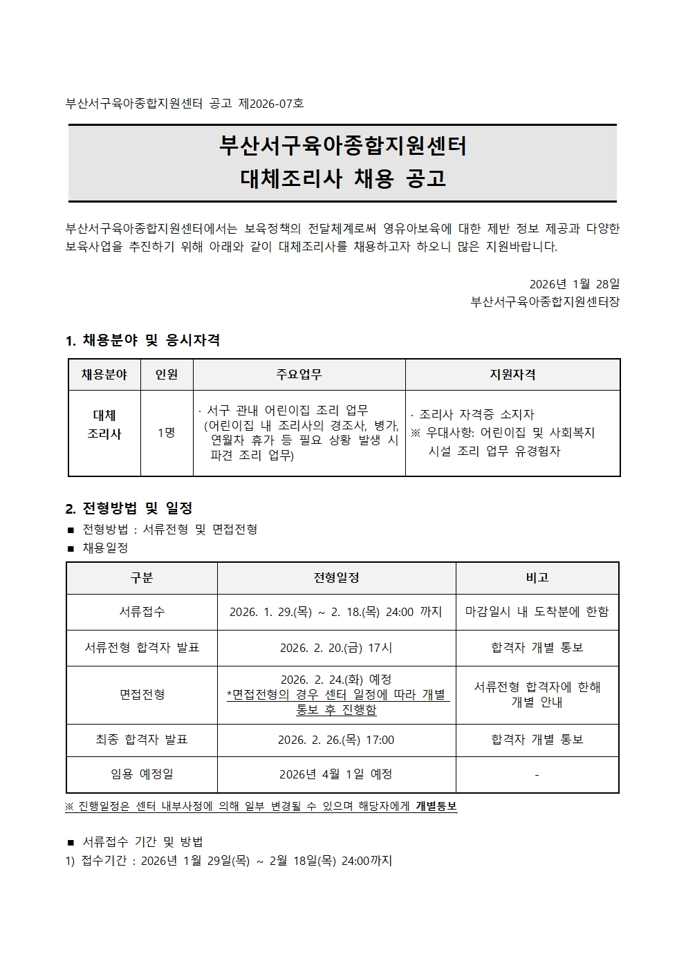 부산서구육아종합지원센터 대체조리사 채용 공고