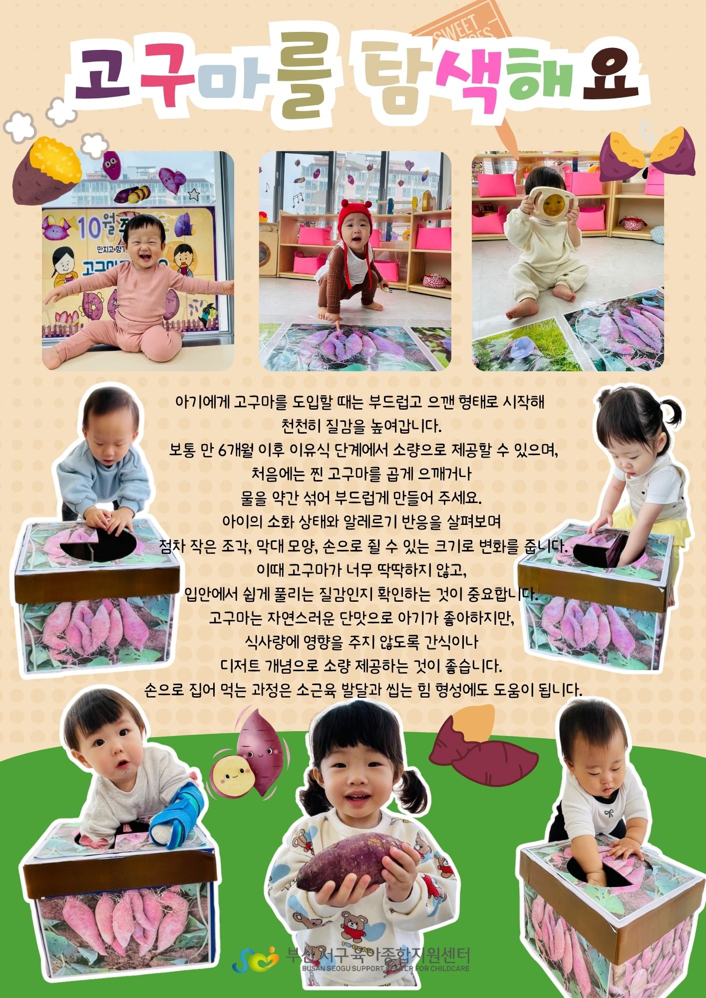 부산서구육아종합지원센터 시간제보육실에서 10월 중점활동으로 [고구마]를 주제로 오감 탐색놀이를 진행했어요!