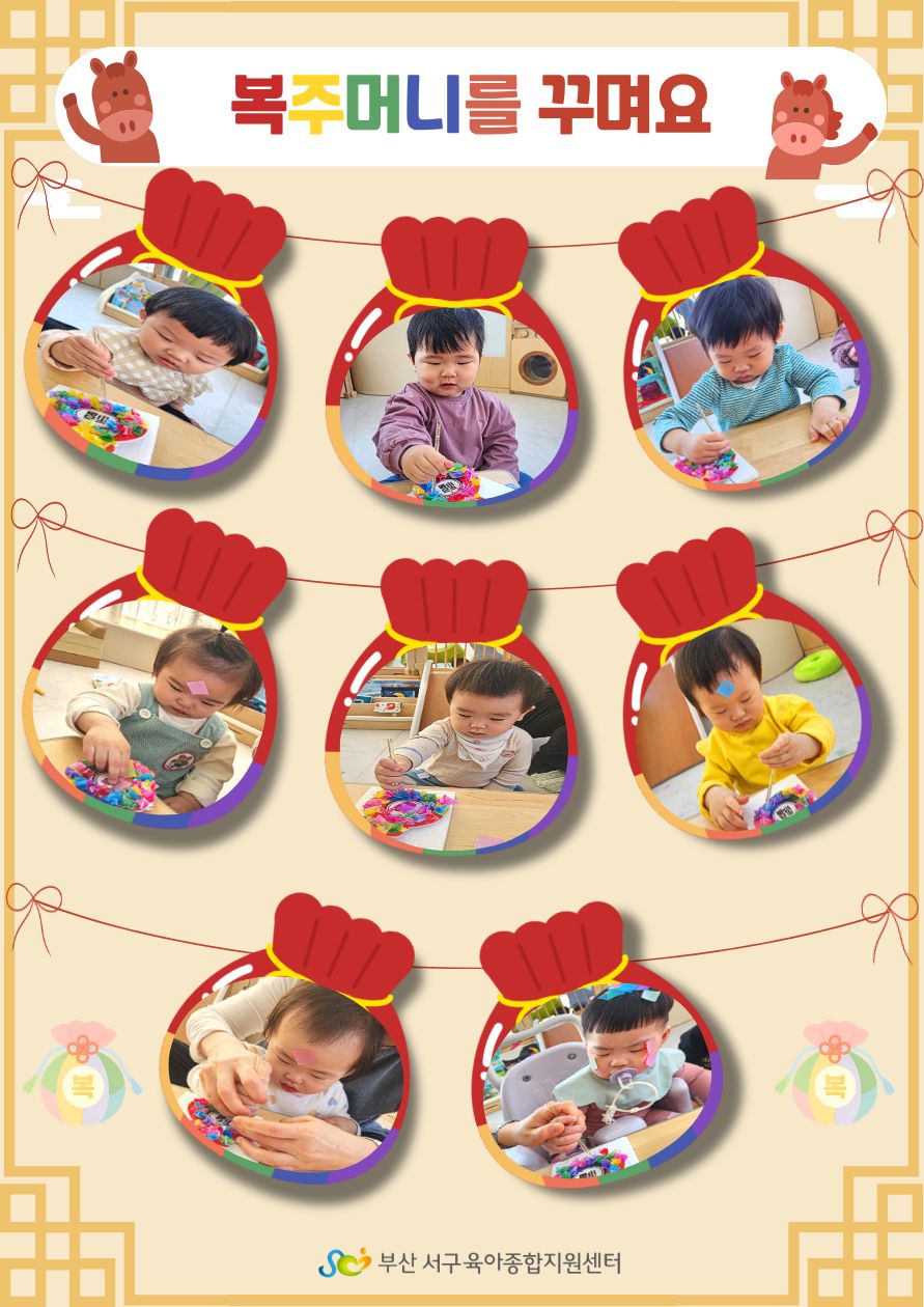 부산서구육아종합지원센터 시간제 보육실에서는 설날을 맞이하여 복주머니 꾸미기 활동을 진행했어요~