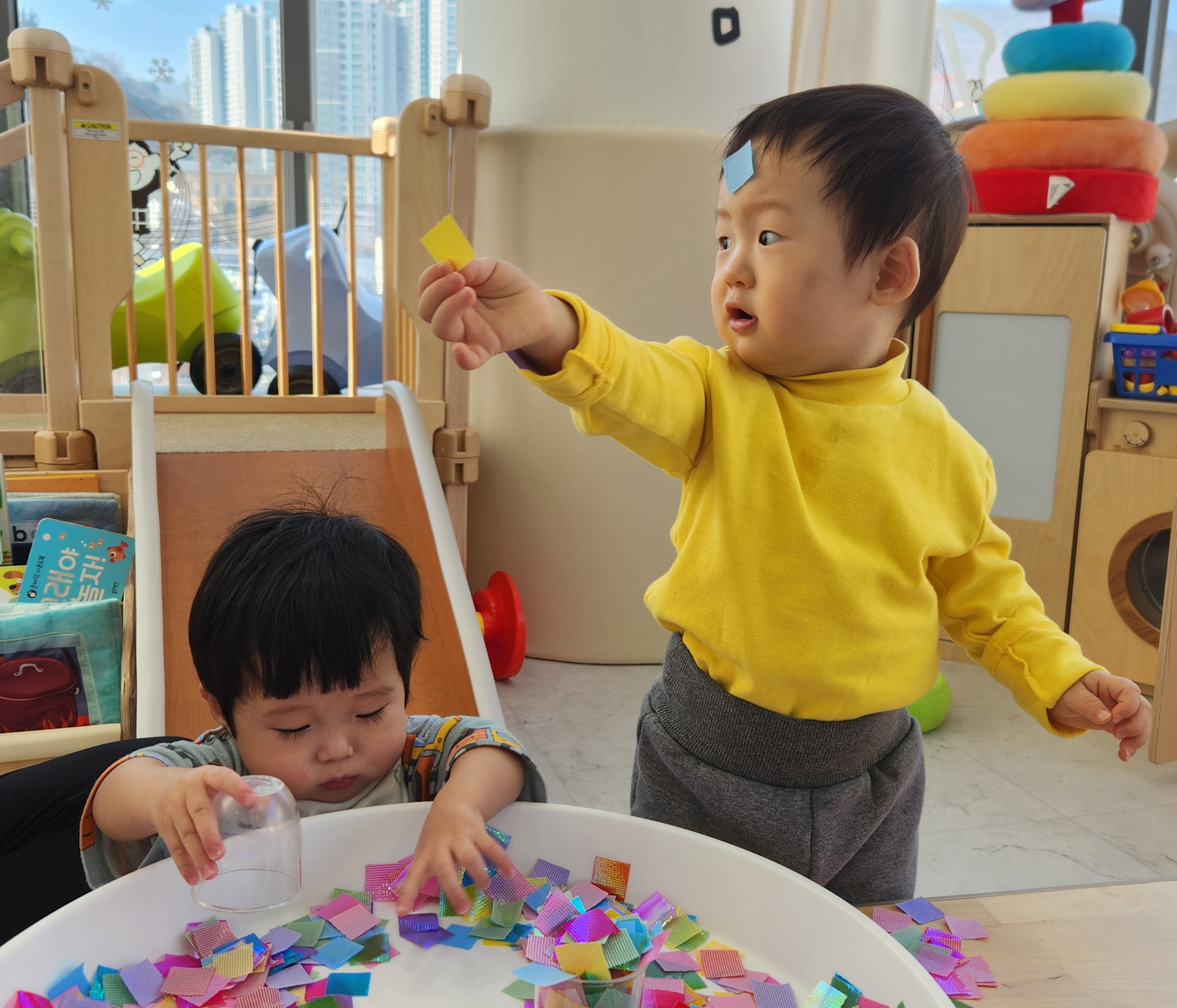 알록달록 종이도 탐색해보고 복주머니 위에 콕콕 끼워보았답니다